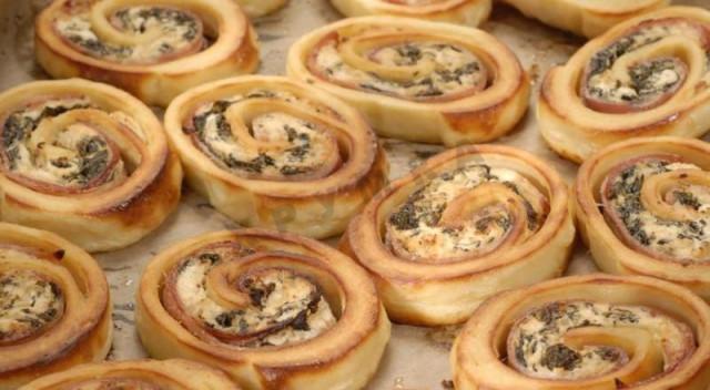 Раскатать картофельное тесто на присыпанной мукой поверхности в прямоугольник размером 35х25 см. Накрыть его полосками бекона. Распределить по тесту шпинатную начинку, оставляя по краям примерно 1,5 см.