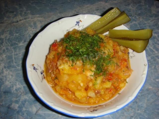 Как только закипела вода и слили пену, положить тушенку и размять ее.