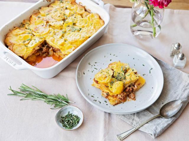 Форму для запекания смазываем сливочным маслом. Выкладываем на дно половину картофеля, затем равномерно распределяем весь подготовленный фарш, завершаем еще одним слоем картофеля в сливках.
