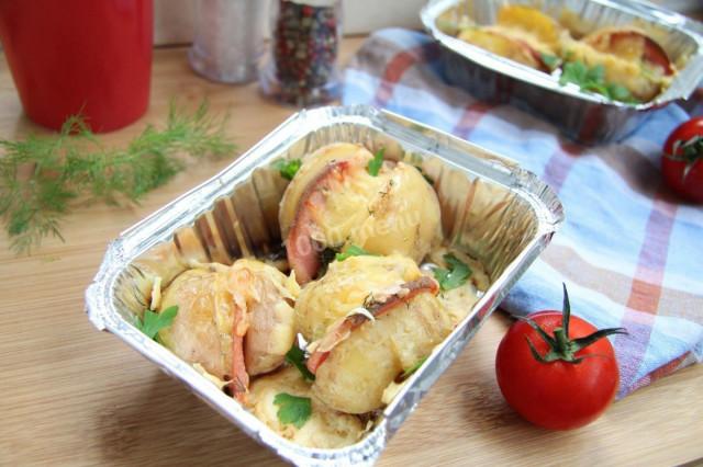 Форму для запекания смажьте каплей подсолнечного масла. Каждую картофелину разрежьте вдоль пополам, но не прорезая клубень до конца. Чтобы получился своеобразный "кармашек".