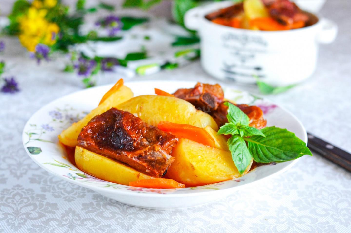 Готовый тушеный картофель с ребрышками разложите по тарелкам и подайте к столу. Приятного аппетита!