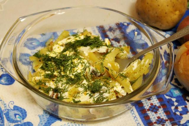 3. На подсолнечном масле быстро обжарить картошку с луком. Выложить в форму для запекания.