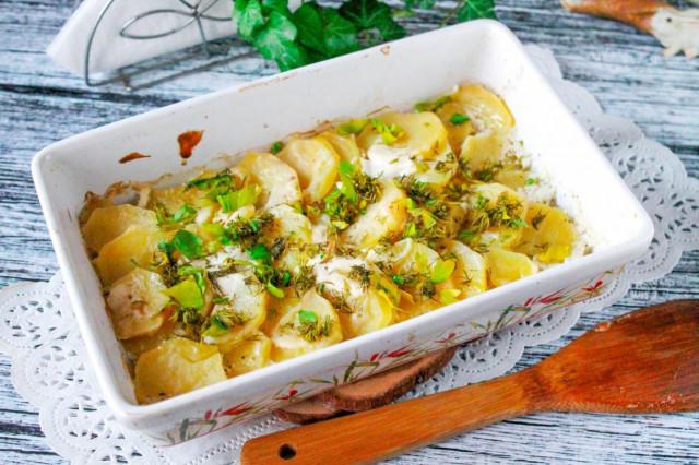 Залейте содержимое формы приготовленной заливкой так, чтобы картошка была ею покрыта. Если заливки не хватит, то сделайте еще.