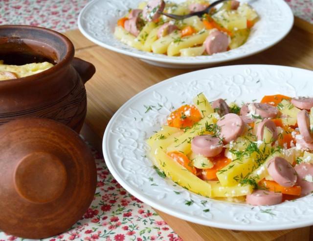 Быстрое и легкое блюдо - справится даже ребенок! Очень люблю запекать в горшочках мясо. В этот раз мяса под рукой не оказалось, зато были сосиски. Получилось достаточно сытно, а главное - быстро.
