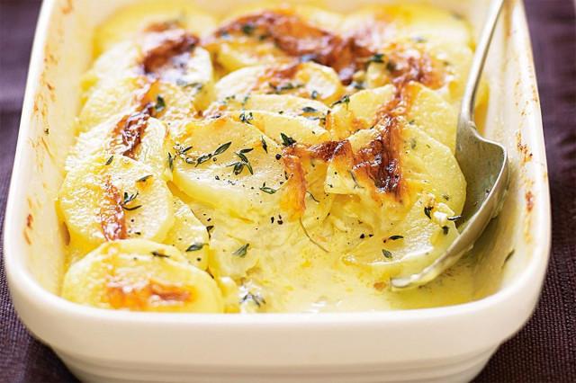 На дно формы для запекания выложить часть нарезанного на ломтики картофеля. Сверху полить взбитым сметанным соусом. Далее вторым слоем снова выложить картофель и опять полить соусом. Продолжать выкладывать картофельные ломтики, пока они не закончатся. Сверху обильно полить оставшимся сметанным соусом. Верхушку присыпать тимьяном.