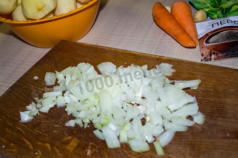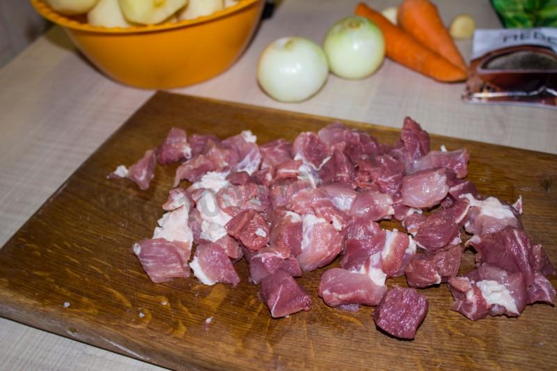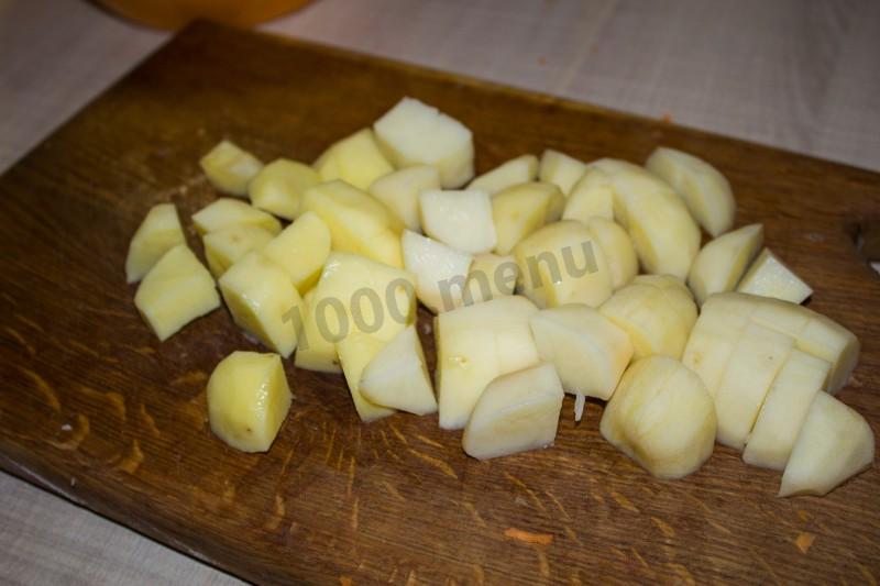 Тем временем произвольно нарезаем картошечку, я порезала крупным кубиком