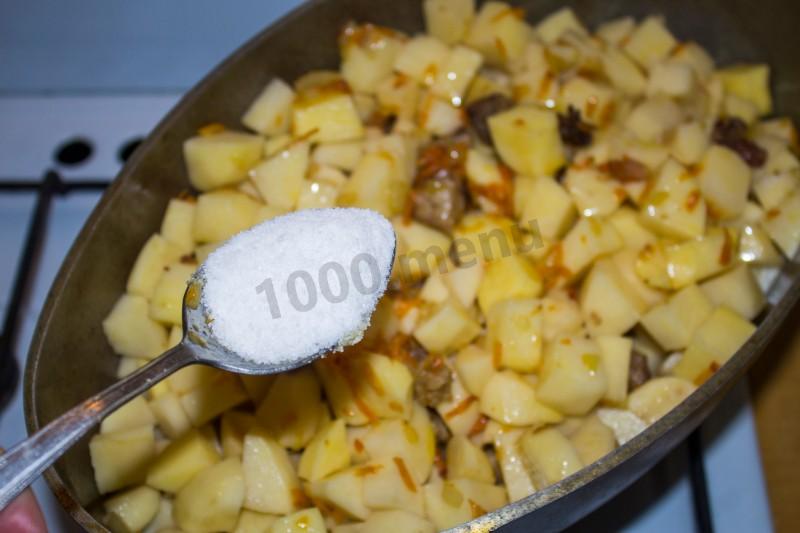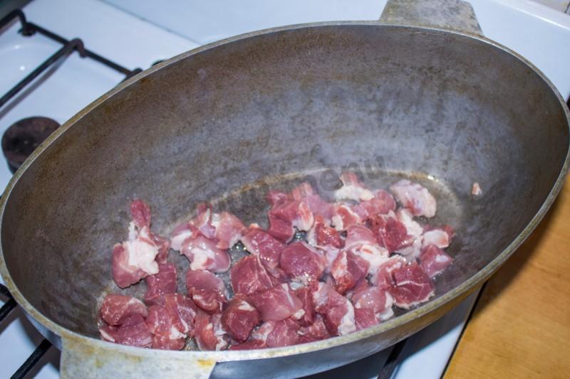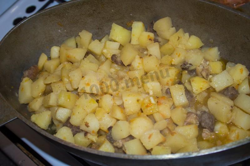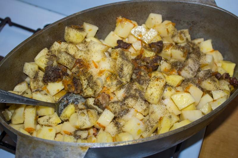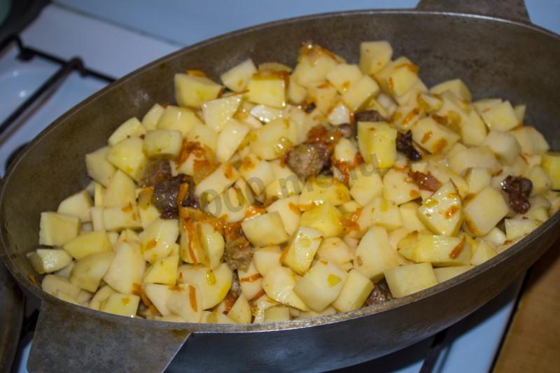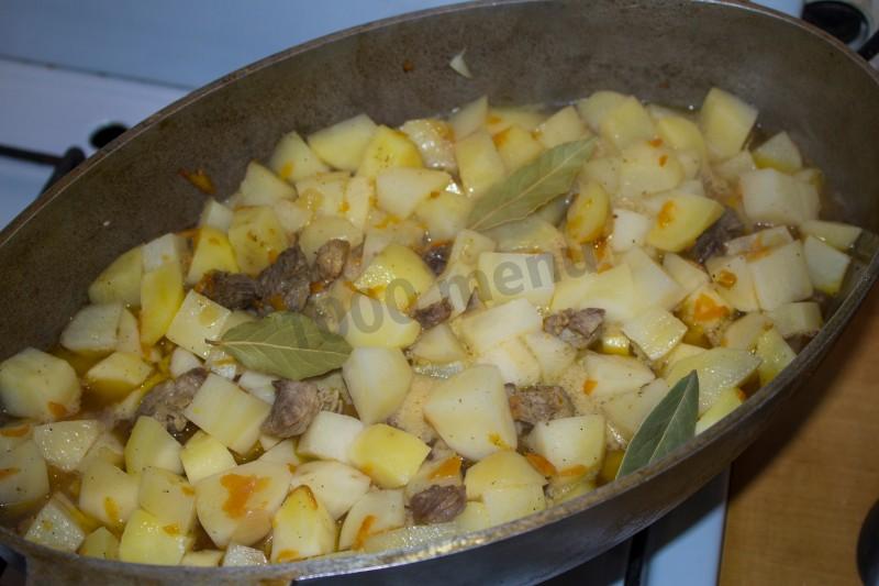 Выкладываем картошку в утятницу к обжаренному мясу с овощами