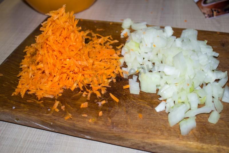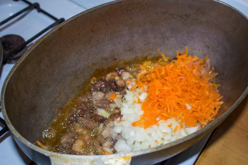 Выкладываем лук с морковкой в утятницу к обжаренному мясу, тушим 5-7 минут на среднем огне