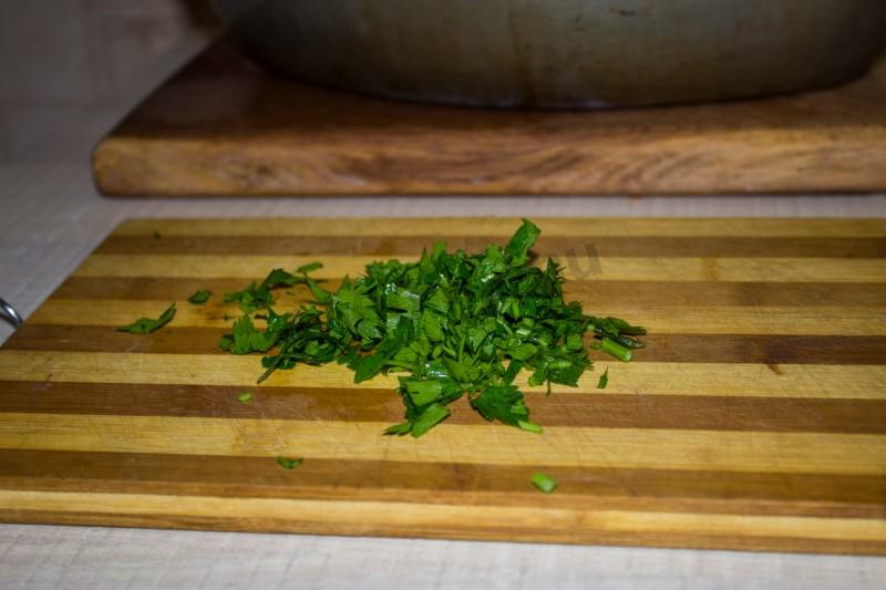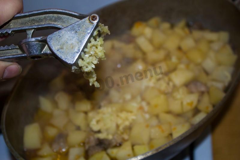 За 5 минут до готовности пропускаем через пресс чеснок, перемешиваем, накрываем крышкой и через 5 минут выключаем