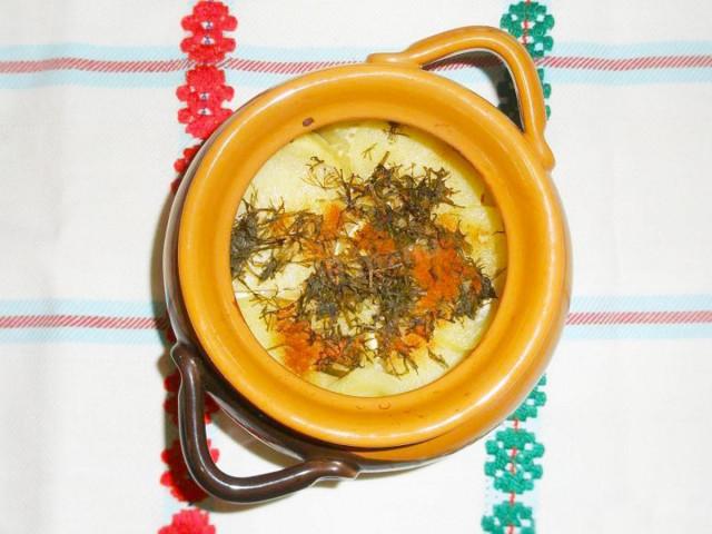 Для заправки смешиваем сметану с небольшим количеством воды, чтобы она стала немного жиже, и было чему испаряться. Кружочки картофеля выкладываем в горшочек по одному слою. Каждый слой солим, посыпаем паприкой и смазываем сметаной. Это проделываем с каждым слоем до самого верха. Сверху посыпаем картошку резаным укропом. Паприку я добавляла для более яркого вкуса и цвета.