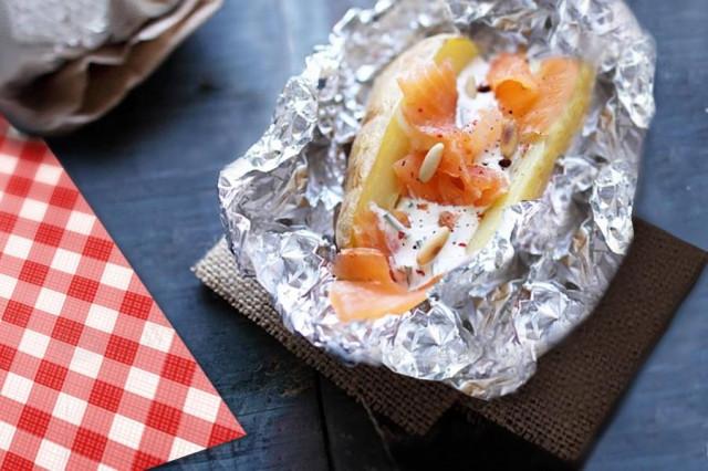 - на запеченном картофеле сделайте глубокий надрез, выложите в него кусочек лосося и немного соуса, посыпьте кедровыми орехами;
