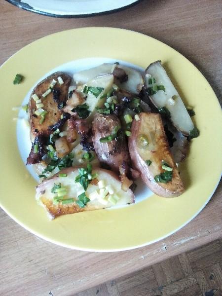 Вынимаем противень из духовки, перемешиваем деревянной лопаткой нашу картошку и посыпаем мелконарезанной черемшой. Ставим снова в духовку на 5-10 мин.