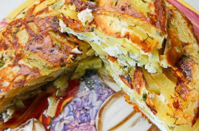 Заливаем яичной смесью картошку, сверху кладем вторую половину масла.