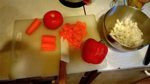 Очищаем лук и морковь (морковь прекрасно обрабатывается с помощью овощечистки) и нарезаем кубиками все овощи
