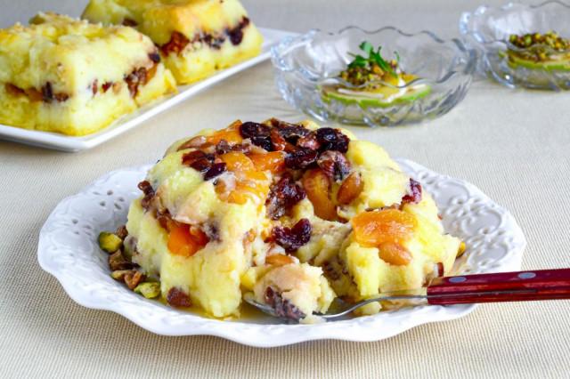 Верхний слой можете слегка присыпать сахаром. Выпекайте гурьевскую кашу около 30 минут в духовке при температуре 180°С. Подайте кашу горячей, выложив на тарелку горкой и полив ее медом.