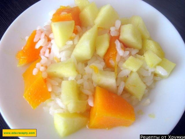 Обычная каша из тыквы с рисом будет еще вкуснее, если в нее добавить яблоки. Такой кулинарный рецепт подсказала мне бабушка. А что касается каш, то она в этом мастер. На завтрак в е доме обязательно есть такая еда, как каша. Я попробовала приготовить эту кашу дома. Дети уплетали за обе щеки. Вот и вам советую. Сначала нужно помыть и очистить от кожуры яблоки. Также вырезать из них сердцевину. Потом порезать яблоки на маленькие кубики и перемешать их с изюмом. Взять тыкву. Очистить ее от кожуры и тоже порезать на кубики такого же размера, как и яблоки. Тыкву сложить в кастрюлю, объем которой два литра. Сверху полить немного растительным маслом. Сварить рис. После того, как он будет готов, половину выложить на тыкву. Сверху рис покрыть яблоками с изюмом. На них снова выложить рис. Сверху его залить оставшейся частью растительного масла. Налить один стакан подсоленного кипятка. Поставить на огонь и варить до размягчения тыквы и яблок. Я готовила в микроволновке. Ставим рис на полную мощность на 10 минут. Вот и все. Приятного аппетита!