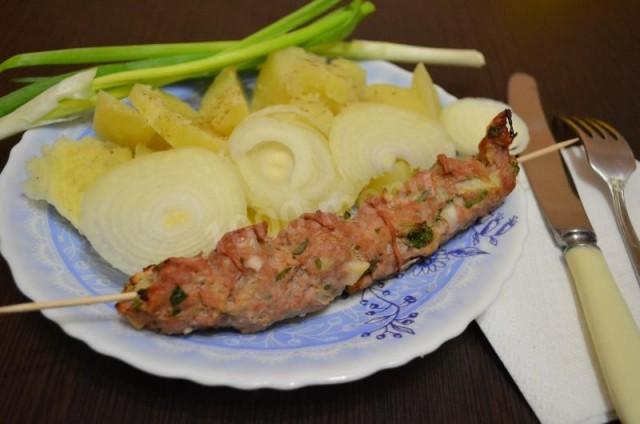 Готовые кебабы я нанизываю на шпажки. На тарелку выкладываю запечёный картофель, люля-кебаб и дополняем кулинарную композицию репчатым и зелёным луком.