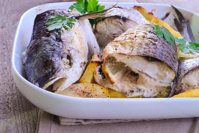 5. Поставить рыбу с картофелем запекаться в разогретую духовку на 30-40 минут в зависимости от размеров рыбы. Если мясо рыбы внутри белое и легко отделяется от кости - кефаль готова и блюдо можно вынимать из духовки.