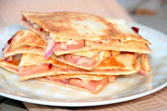 1. Положите тортилью на плоскую тарелку или разделочную доску, чтобы потом легко перенести её со стола в сковородку. Теперь смажьте тортилью давленной клюквой и распределите равномерно по всей площади тортильи ломтики колбасы и пластинками порезанный лук.