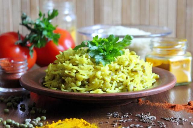 Пряное индийское блюдо из риса и бобов мунг. Традиционное индийское блюдо. Такое блюдо подойдет любителям риса, а также вегетарианцам и веганам, если масло Ги заменить на растительное. Также это блюдо можно употреблять тем, кто поститься или на диете.