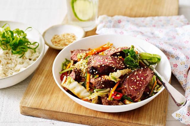 8. Поливаем ингредиенты оставшейся пряной смесью, перемешиваем. Выкладываем поверх салата говядину, посыпаем семенами кунжута.