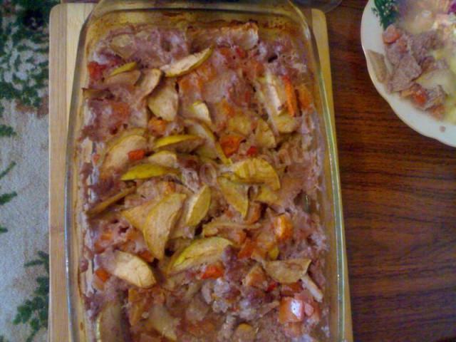 Мясо нарезать ломтиками и отбить до состояния, когда начинают рваться волокна. Приготовить соус: в миску налить вино, добавить мелко нарезанные помидоры, вбить яйца, уксус, соль, перец, порезанные тонкими ломтиками яблоки. Добавить муку и всё равномерно перемешать.