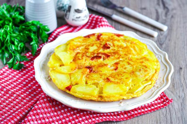 Готовую тортилью переложите на блюдо и подавайте к столу. Вот такая она получается красивая, с золотистой корочкой и вкраплениями кусочков болгарского перца. Приятного аппетита!
