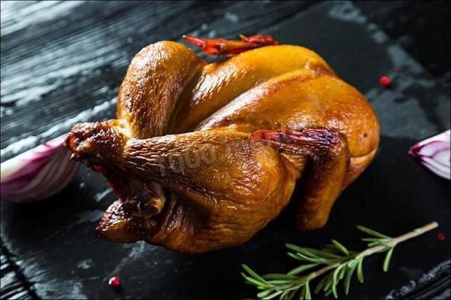 Извлекаем тушку из кастрюли, даем обсохнуть (курица за это время не сварилась, она полуготовая - это нормально). Теперь пришло время поместить ее в коптильню на два-три часа (готовность определяйте по внешнему виду курицы - она должна стать очень румяной, почти коричневой).
