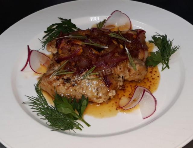 Свиная корейка-200гр. делим на 2 части по по 100гр.,делаем несколько надрезов со стороны жира(для того чтобы стейки не деформировались во время жарки).Слегка отбиваем,солим,перчим. Ставим на средний огонь сотейник или маленькую кастрюльку,вливаем 40гр. оливкового масла и когда масло нагреется высыпаем туда нарезанный перьями красный лук(жарить пока лук станет мягким). Из половинки апельсина и лемона делаем фреш(свежевыжатый сок),выливаем в лук,добавляем апельсиновый джем,соль,перец,веточку розмарина и тушим 15-20мин. на маленьком огне (пока лук станет полностью мягким). В это время нагреваем гриль-сковороду(у кого нет сойдет и обычная сковородка,но на гриле получается кпасивее), вливаем оставшееся масло,веточку розмарина и обжариваем до готовности на сковороде.