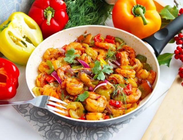 Креветки с овощами можно подать на ужин с отварным рисом.