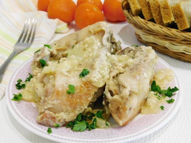 Мясо кролика очень нежное и отлично сочетается с тушеным луком. Приготовленные вместе они составляют такой гармоничный дуэт, что добавлять ничего лишнего нет необходимости.