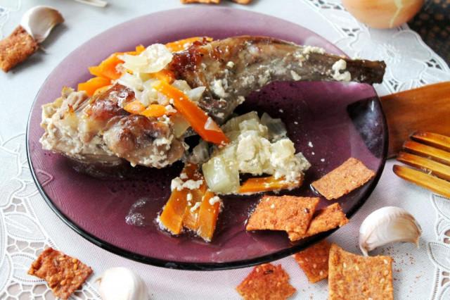 Залейте кролика с овощами полученным соусом. Затяните фольгой или накройте форму крышкой. Верните блюдо в духовку, через 20 минут убавьте ее жар до 160 градусов. Всего на запекание у меня ушло 100 минут.
