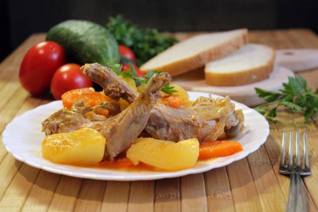 По истечение получаса кролик должен быть уже мягкий и почти готовый. Добавляем в казан картошку с морковью и доливаем кипятка почти до верха картошки. Но можно чтоб вода не полностью ее покрывала. Тушим так еще 10-15 минут до готовности картошки и морковки.