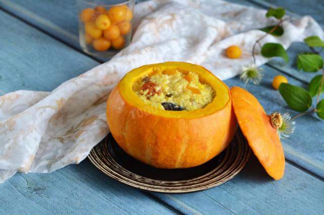 Подавайте кашу прямо в тыкве, разрезав овощ острым ножом на порционные части. Приятного аппетита!