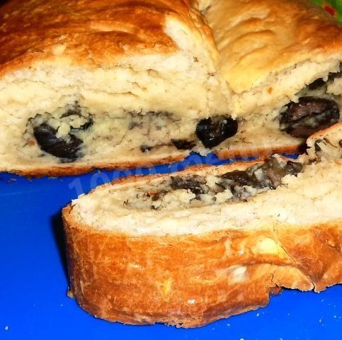 Раскатываем тесто на столе, чуть присыпаем мукой и выкладываем в центр начинку. Заворачиваем, формируя пирог в виде хлебного батона, делая шов по верхней части. Обмазываем яичным желтком и ставим в духовку на 20 минут.