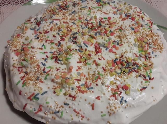 Украшаем кулич белковой глазурью и кондитерской посыпкой.