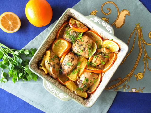 Форму с куриной грудкой вынимаем из духовки, сверху и между кусочками раскладываем кружочки апельсина. Ставим форму снова в духовку на 15 минут. Вынимаем и сразу подаем. Приятного аппетита!