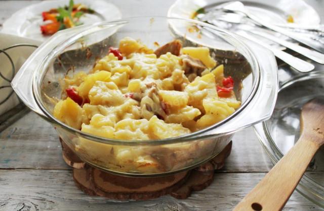 В любой жаропрочной форме (у меня из толстого стекла) соедините полуготовый картофель, лук и перец.