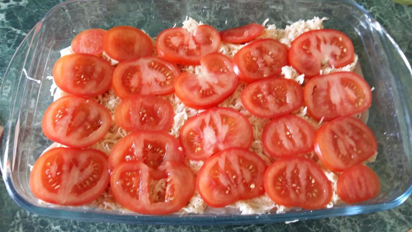Помидор порежьте тонкими кольцами и выложите сверху на картофель