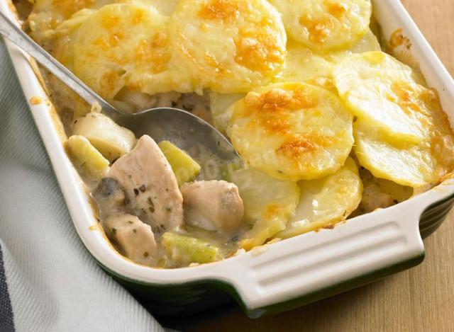 Пока курица и грибы доходят до готовности, займемся картофелем. Овощи чистим, моем и нарезаем колечками. Сыр натираем на крупной терке. Смесь курицы и грибов выкладываем в жароупорную форму, равномерно распределяем. Картофель раскладываем колечками поверх курицы, так, чтобы картошка полостью покрывала мясо и грибы внахлест. Присыпаем сыром и отправляем в духовку для запекания. Готовность определяется по внешнему виду сыра, он должен запечься аппетитной корочкой и начать пузыриться. И, конечно, проверяем картофель на мягкость. В зависимости от мощности духовки, процесс занимает 45-60 минут.