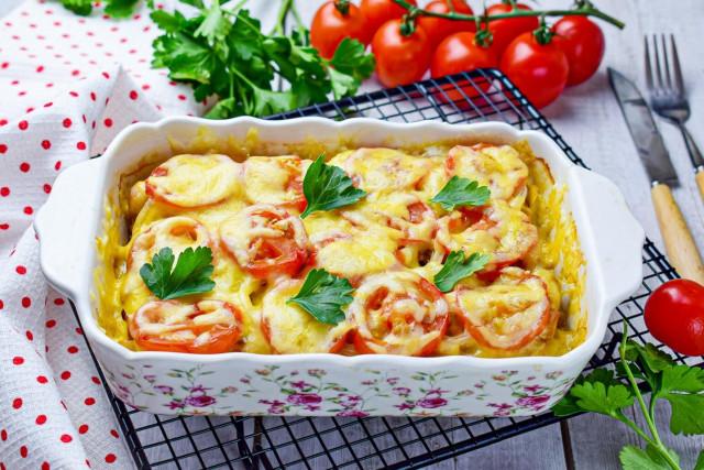 А сверху выложите помидоры, нарезанные кружочками. Накройте форму фольгой и поставьте в духовку, разогретую до 200 градусов на 30 минут.