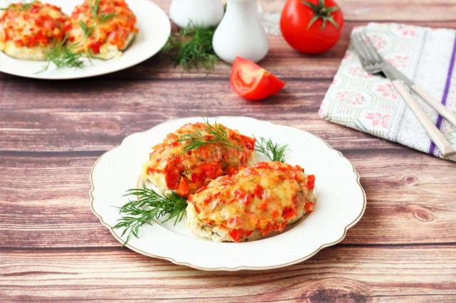 На каждый кусочек филе выложите овощную массу, немного прижимая ее.