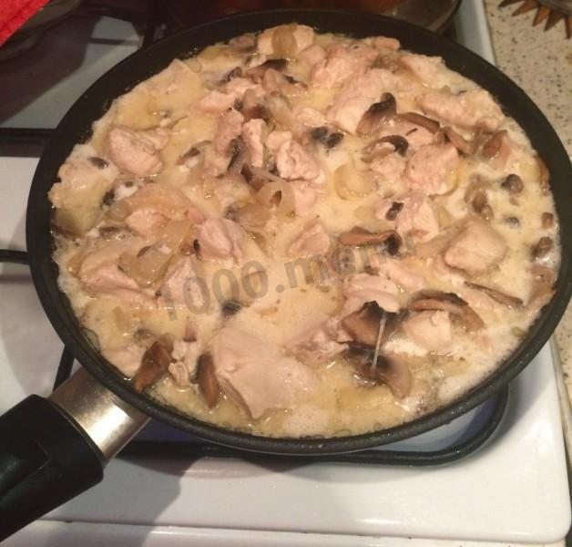 Куриное филе с шампиньонами, луком и чесноком в сливках