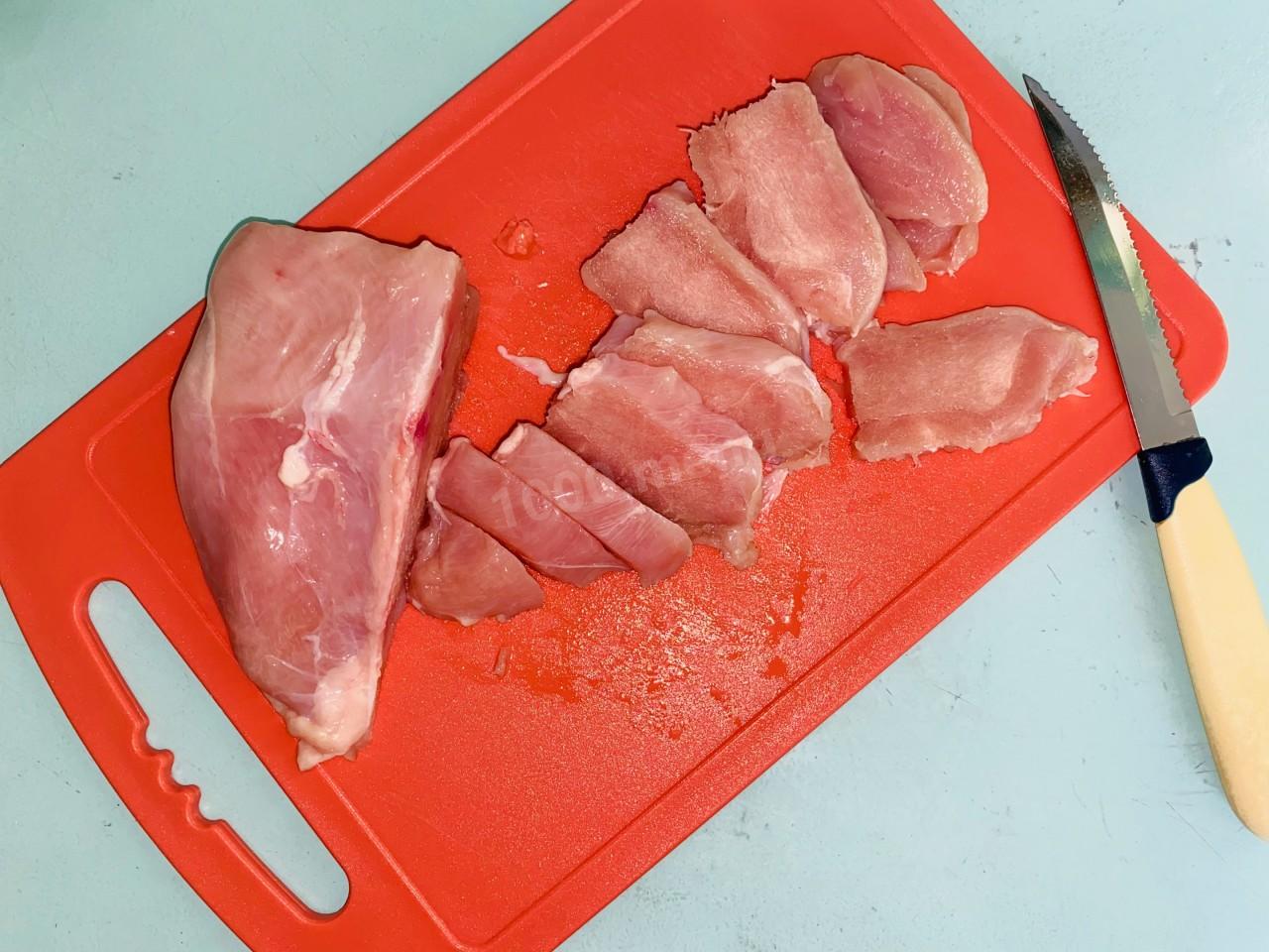 Нарезаем подготовленное куриное филе шириной в 1 см. Всё филе перекладываем в любую глубокую посуду, я использовала чашку.