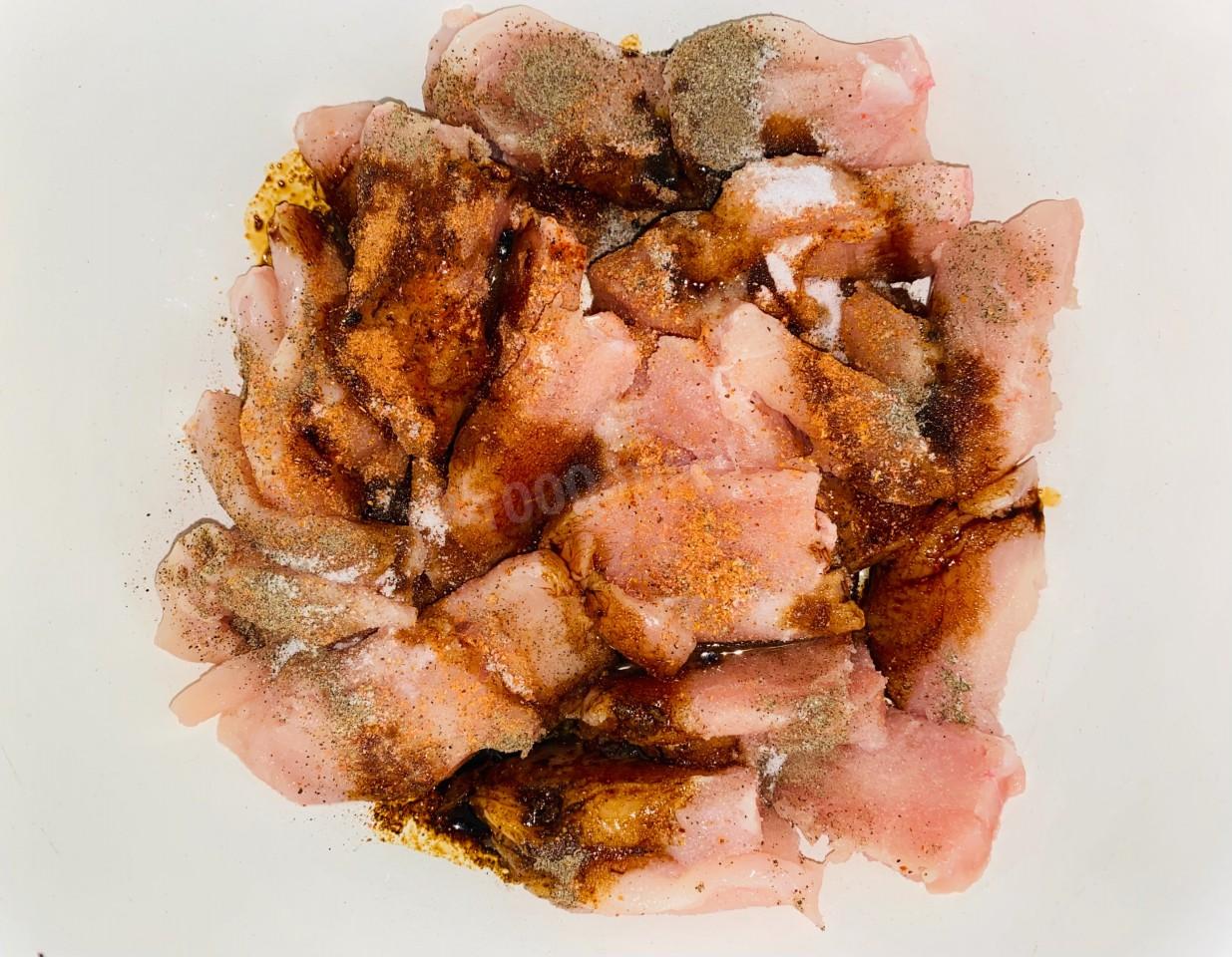 В чашку к нарезанному куриному филе добавляем красный, черный перец, соль, поливаем оливковым маслом и соевым соусом. Все перемешиваем, я мешаю рукой, как бы слегка втирая маринад. Оставляем мариноваться на 30 минут прямо на столе.