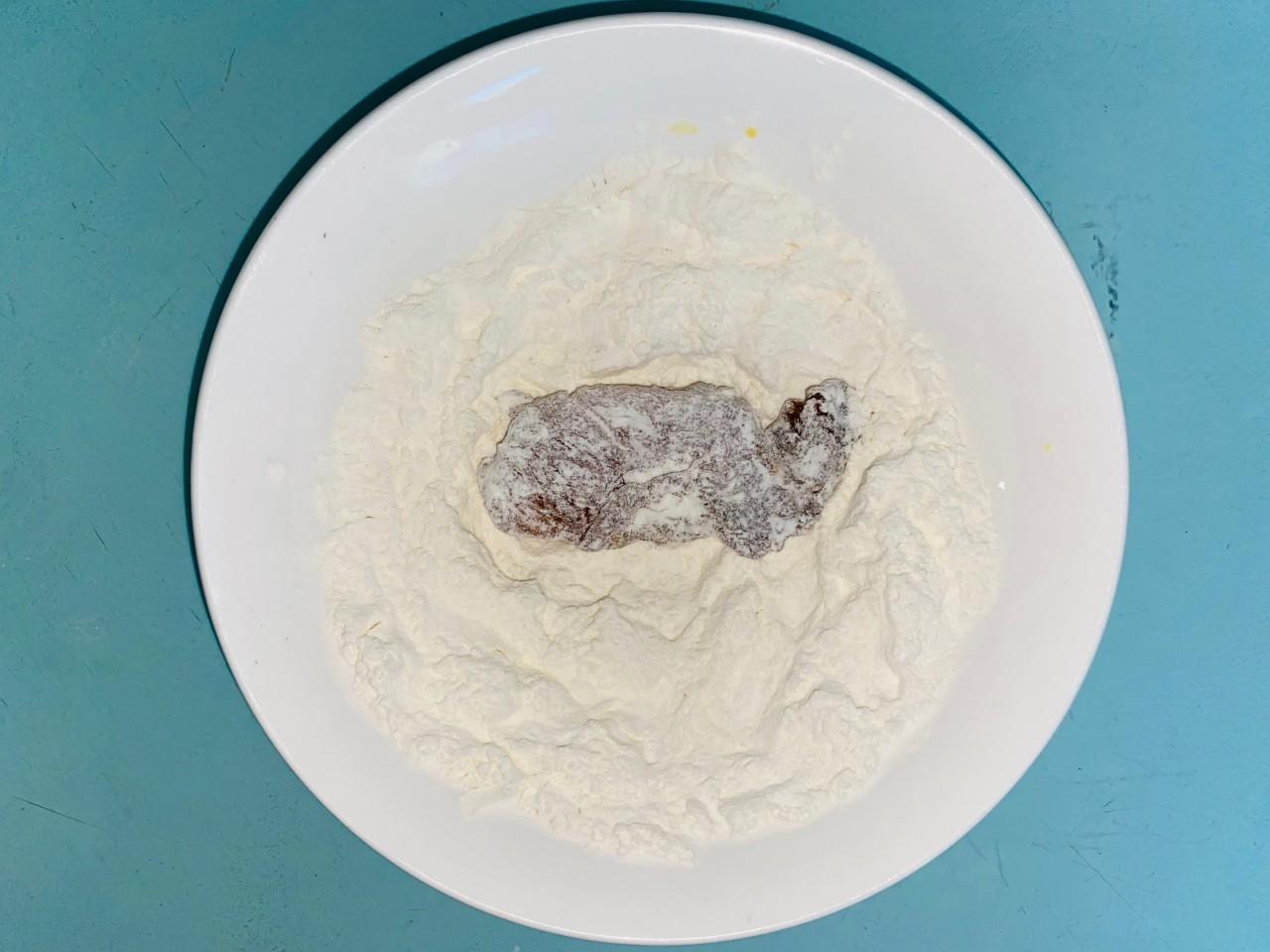 Маринованное куриное филе обваливаем в муке с двух сторон, лишнюю муку стряхиваем. Я где-то по 5-6 кусочков обваливаю в муке, потом перехожу к следующему шагу.