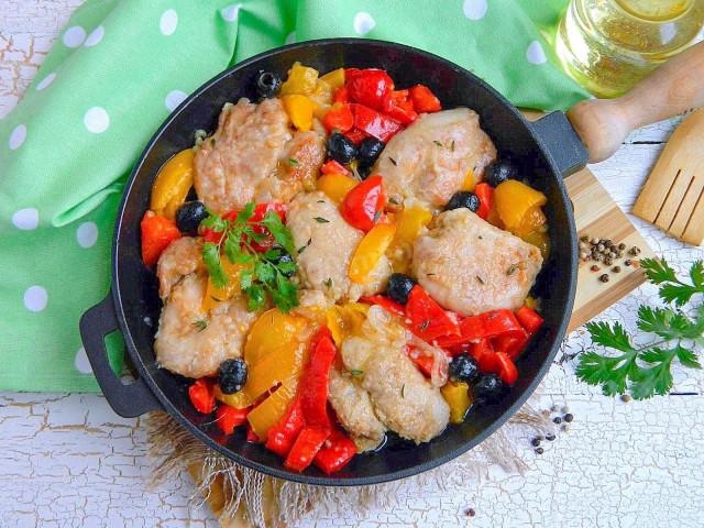 Вкусный ужин из сочной курицы с яркими овощами и маслинами. По этому рецепту куриное филе получается нежным и сочным. Так можно приготовить любую часть птицы. Лучше всего это блюдо делать осенью, когда у овощей насыщенный вкус и цвет.