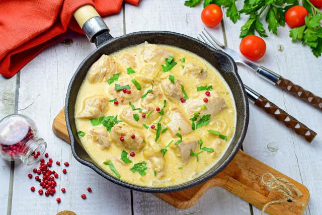 Как сделать куриное филе в сметане на сковороде? Подготовьте для этого необходимые ингредиенты.