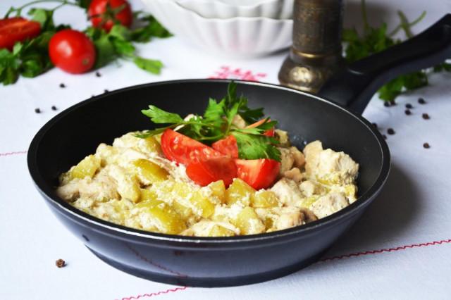 7. К курице и кабачкам добавить сметану. Все аккуратно перемешать.