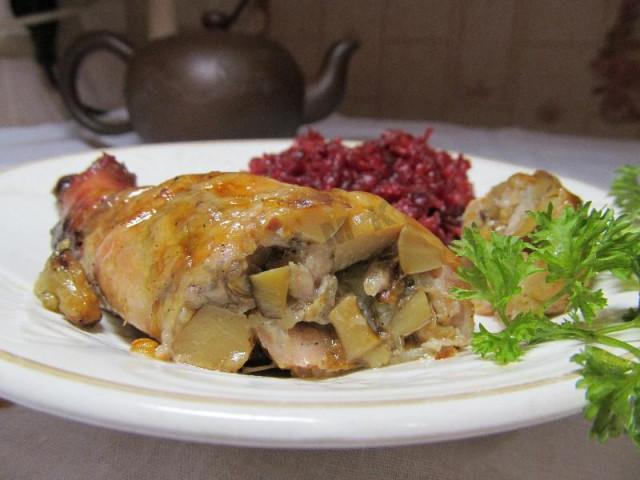 Форму смазываем маслом. Выкладываем фаршированные грибами голени и отправляем в разогретую до 180 град. духовку на 30 мин.